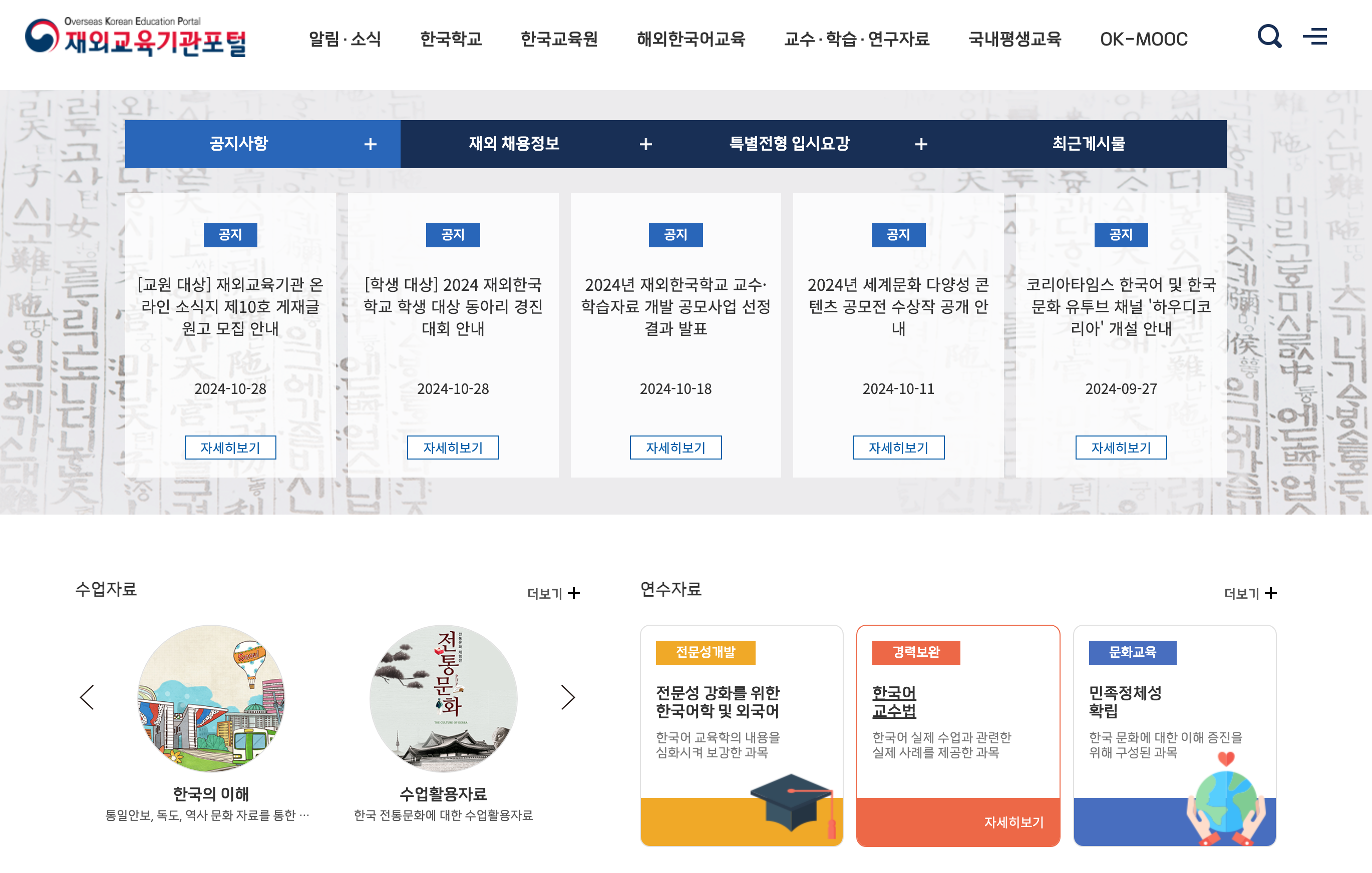 재외교육기관포털은 해외에서 한국어 교육을 지원하는 교사와 한국 교육을 담당하는 기관을 위한 포털 사이트입니다. 이 사이트는 해외 한국어 교육 환경에 맞춘 자료와 교육 자료를 공유하며, 교육자들 간의 네트워크 구축도 돕고 있습니다. 다양한 교재와 교육 자료뿐만 아니라 재외 한국어 교사를 위한 최신 교육 정보, 교육 프로그램 안내도 제공하여, 재외 교육자들이 최신 자료와 교육 방식을 활용할 수 있도록 돕습니다.