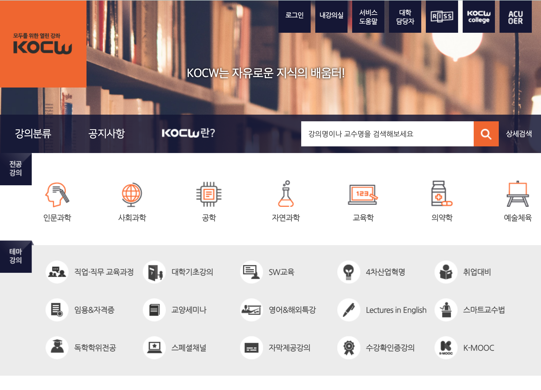 KOCW는 한국교육학술정보원에서 제공하는 공공 강의 자료 제공 사이트로, 한국어뿐만 아니라 여러 학문 분야에 걸친 강의를 무료로 제공합니다. 한국어와 한국 문화 관련 강의뿐 아니라 언어 교육 이론 및 실습 강의가 포함되어 있어 학습자와 교육자 모두에게 유용한 자원입니다. 이곳에서는 교수자와 학습자가 다양한 주제를 선택해 강의를 수강할 수 있으며, 강의 자료와 참고 자료도 제공되어 깊이 있는 학습이 가능합니다.