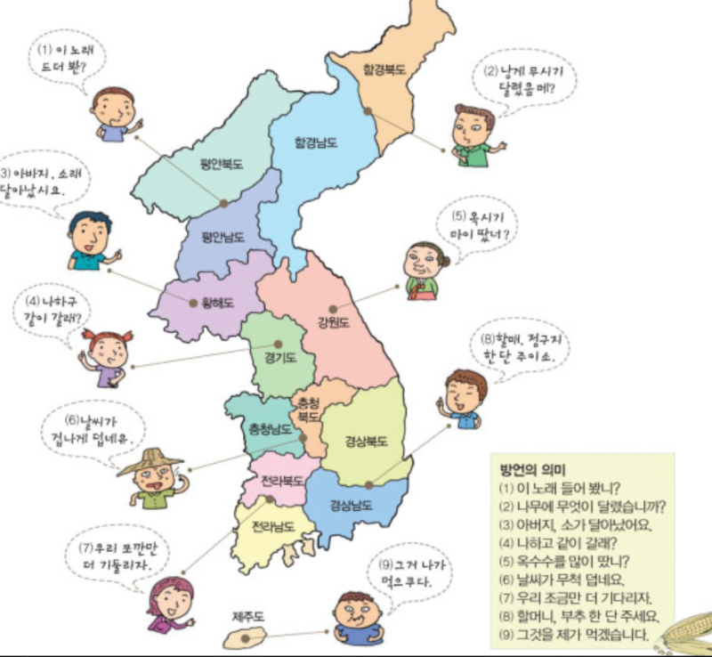 1. 표준어, 2. 지역의 방언, 3. 과거의 한국어(고대 한국어, 중세 한국어, 근대 한국어)